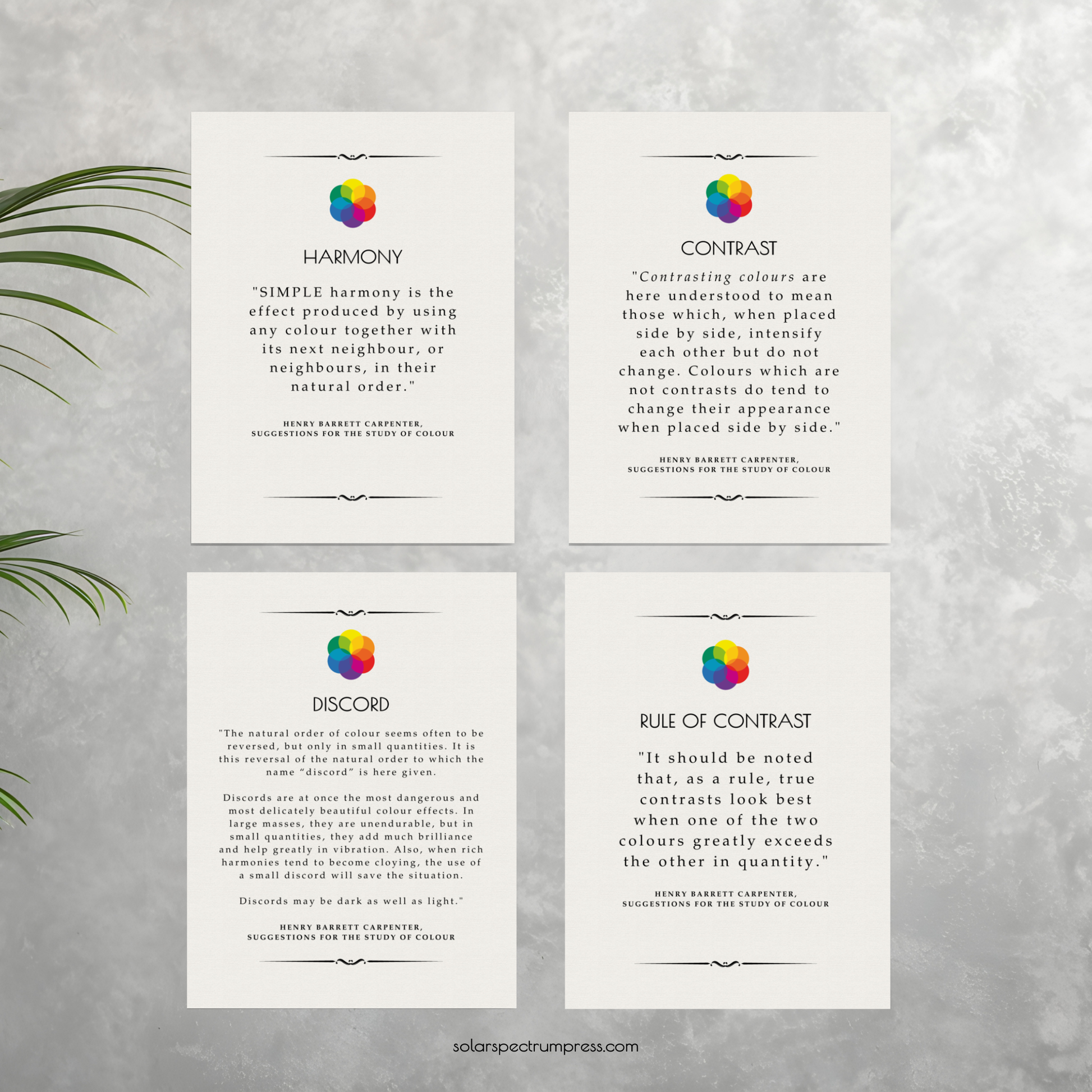 Save 10% with this beautiful, unframed vintage-themed poster set, featuring key color theory quotes from 'Suggestions for the Study of Colour' by Henry Barrett Carpenter. Hanging them on your wall will act as inspiration and a helpful reminder of these chief principles of color theory.
